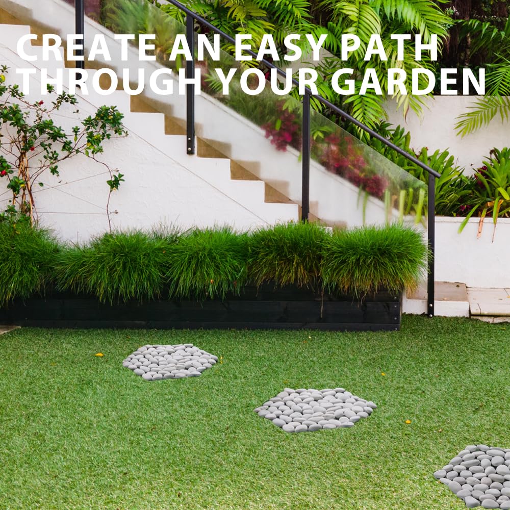 - 【Duarble Backing】The river rock are set on a weather-durable PVC fiber backing. There is a space between the rocks where you can see the backing, so they can be laid over grass and allows soil to settle between stones. You can leave this river rock stepping stone outside all year long. Our high quality stepping stone can also be used as construction material, you can concrete the step stones by placing it on top of wet concrete so that the rocks are better secured after it dries.