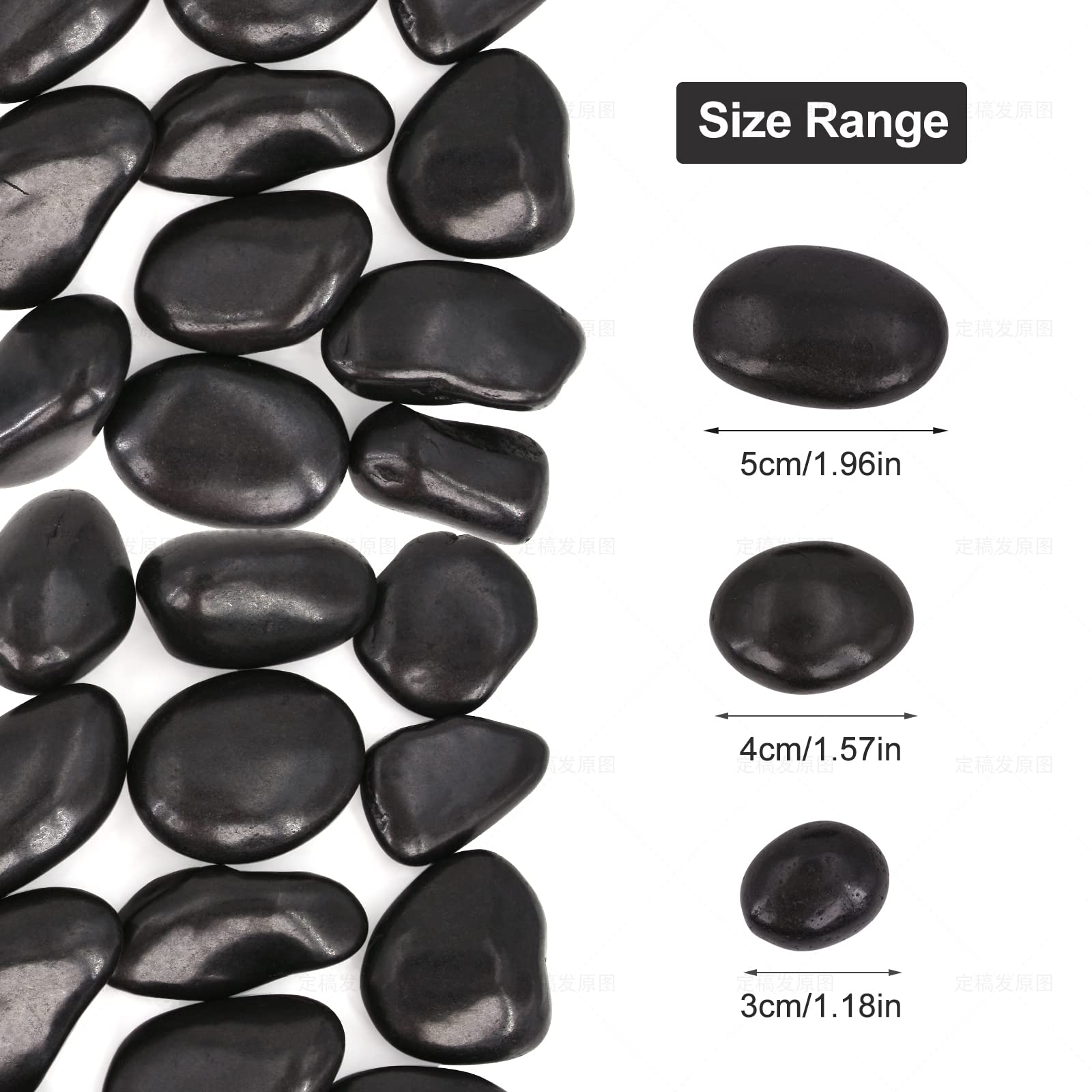 - COLOR AND SIZE: The length of our slight polished black river rock stone is about 1 to 2 inches, the large size and the beautiful bright black color makes these stones ideal for use indoor and outdoor for a unique decorative assent. If you use the large black rocks to decorate potted plants, our black pebbles with perfectly polished accent will make your plants really stand out. These black rocks will add extra upscale touch to your interior designs or outdoor garden landscaping projects.