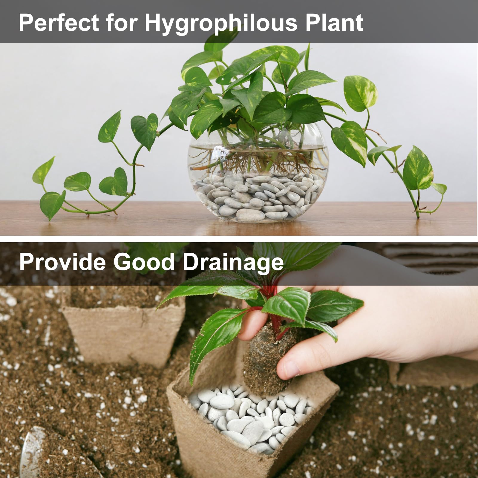 - ROUND AND SMOOTH: Our polished pebbles for plants are tumbled to produce the smooth and round rock for all creative interior and exterior designs. No sharp edges, ready to get on your feet. River rocks are gift from nature, so they are in different shapes such as oval, round etc. Due to their shape, these rocks are perfect for bottom of planters for drainage to help soil retain moisture. At the same time, the river rocks make planters have a pop of elegance.